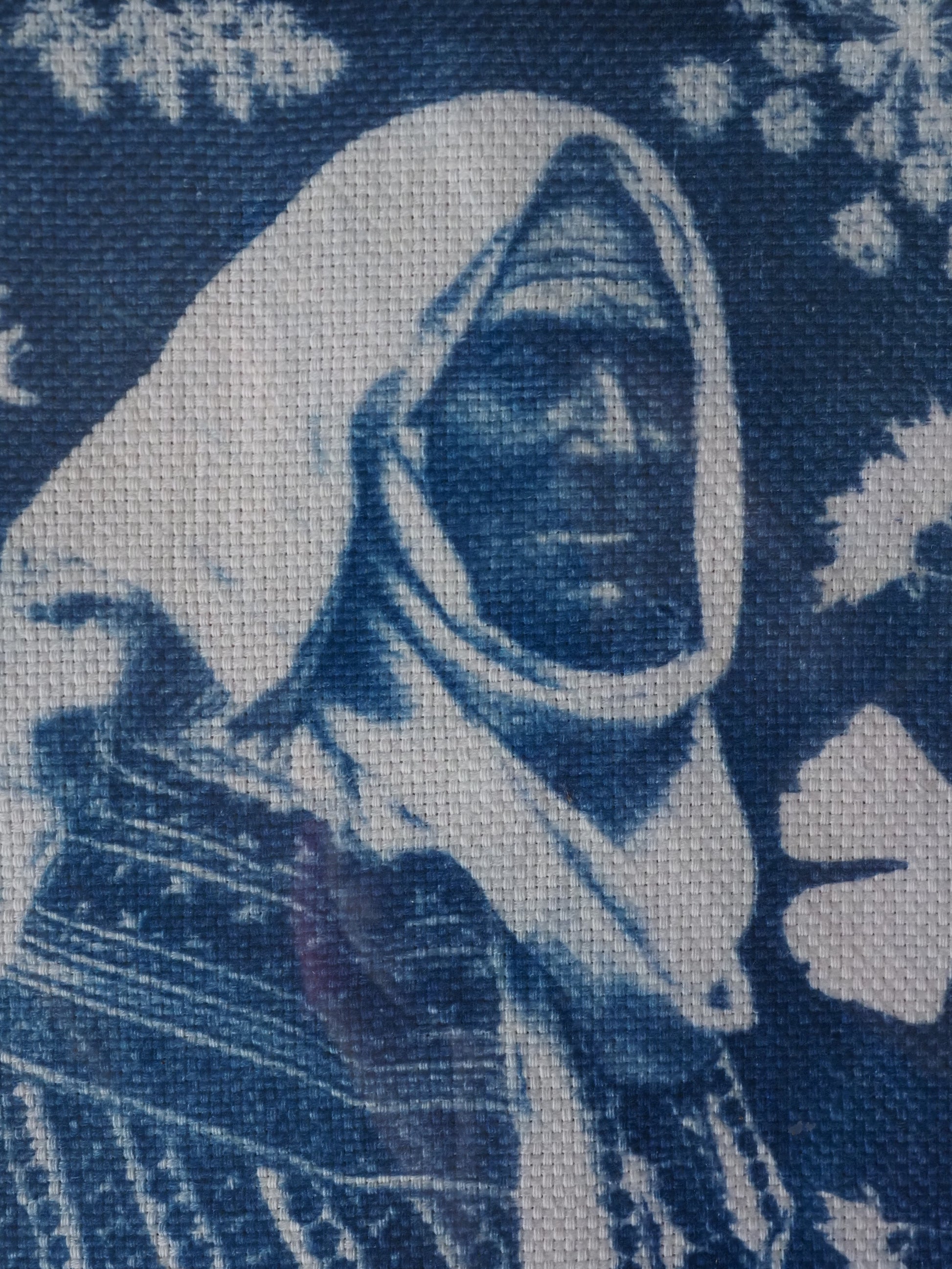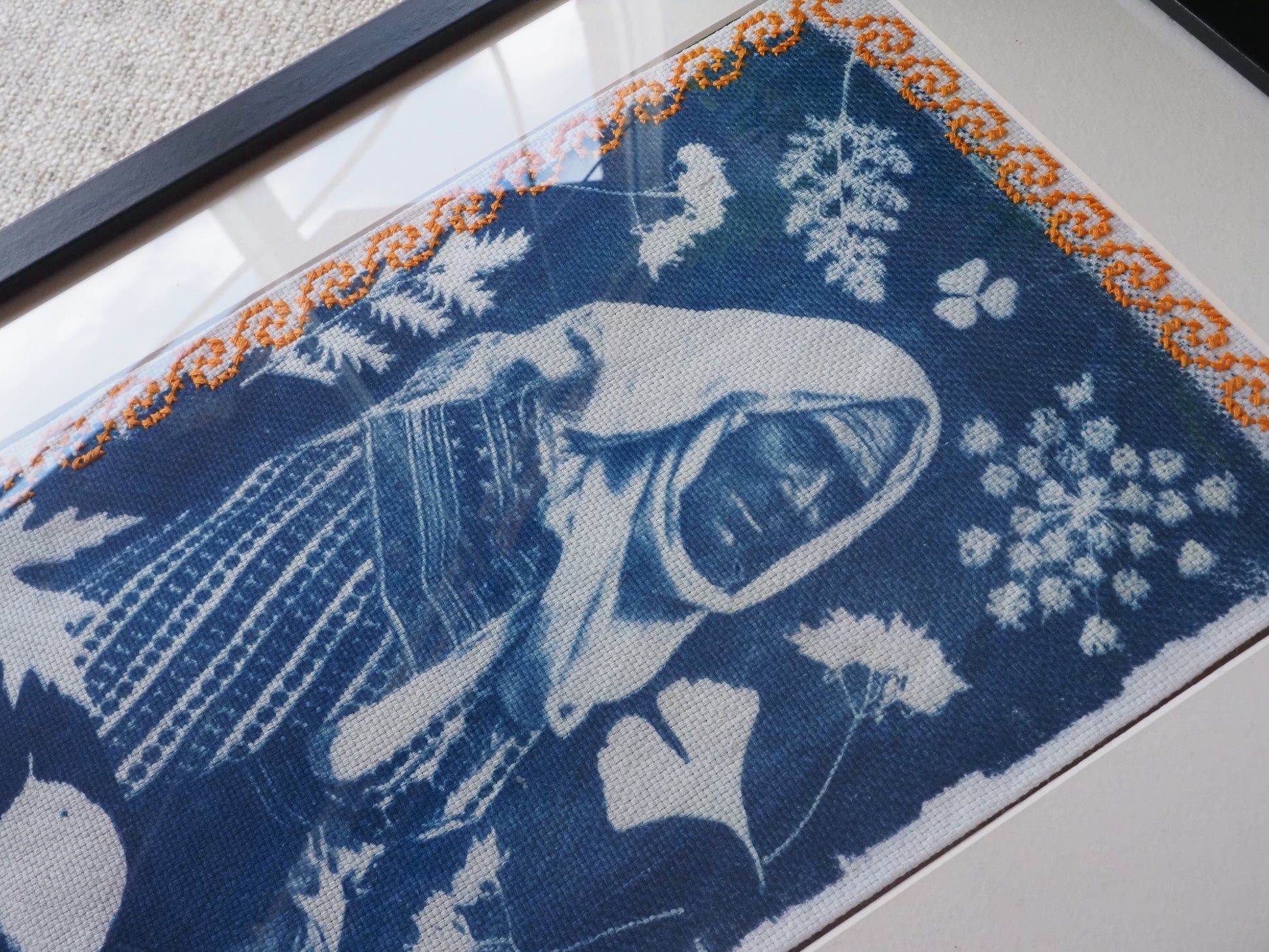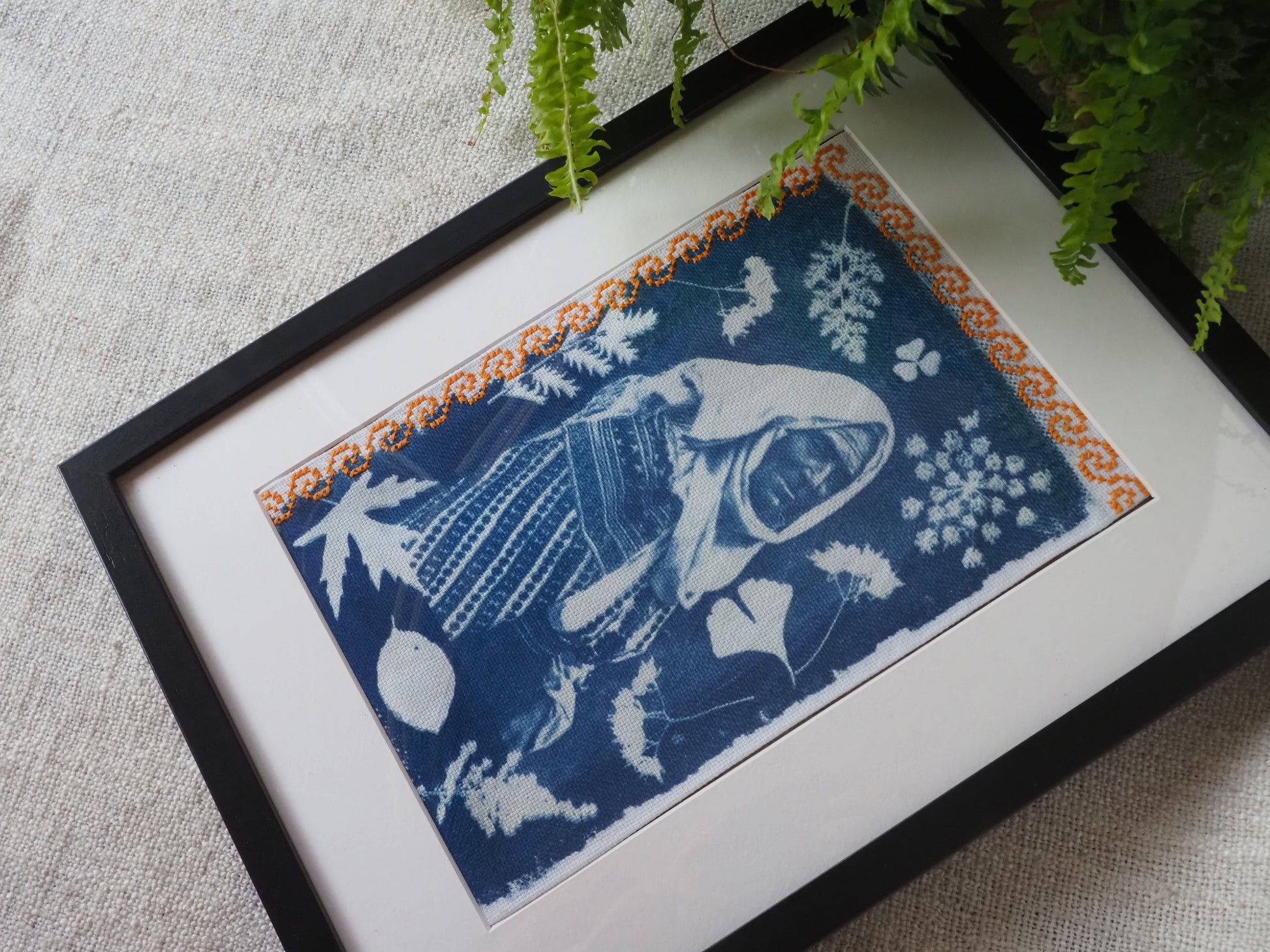 Esta obra combina la delicadeza de la cianotipia sobre tela con la textura artesanal del bordado en punto de cruz. La imagen, impresa con la huella azul característica de la cianotipia, se transforma al ser intervenida con hilos de color, creando un diálogo entre lo fotográfico y lo textil.