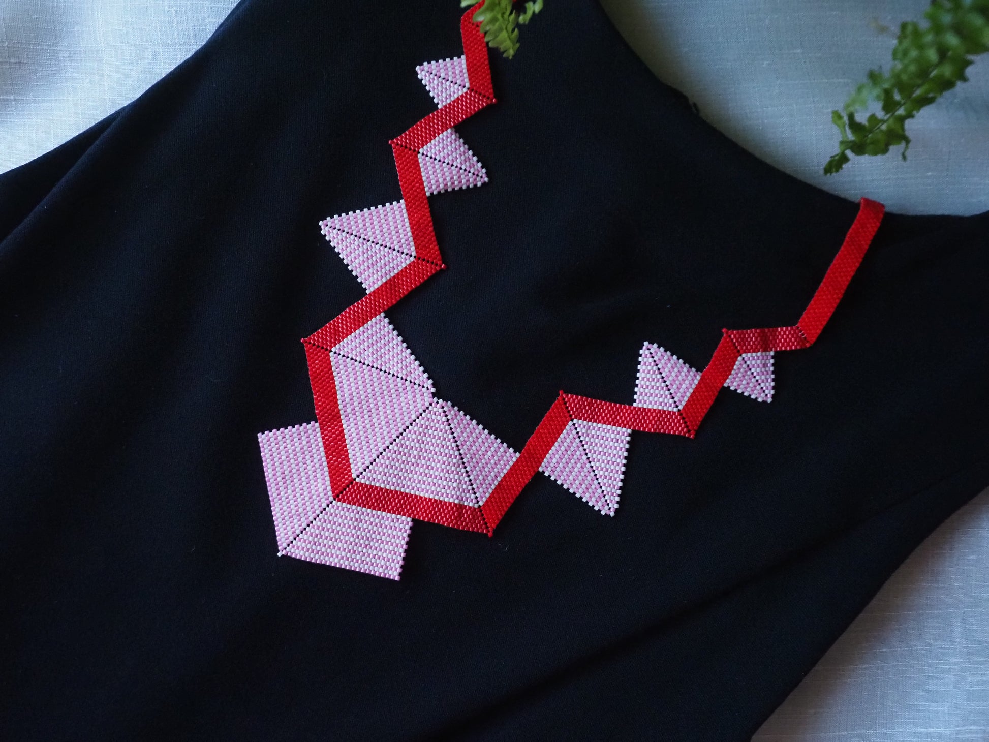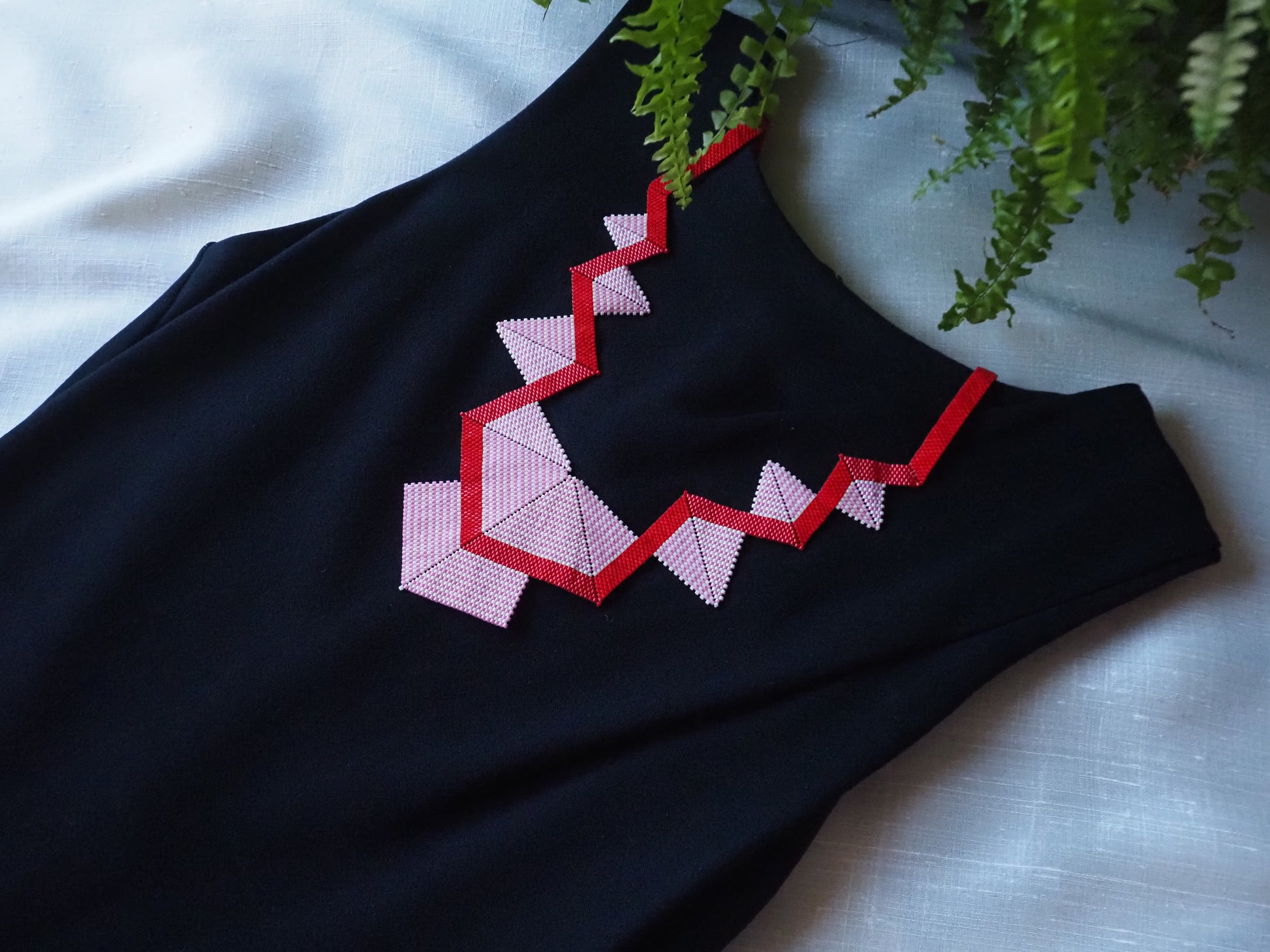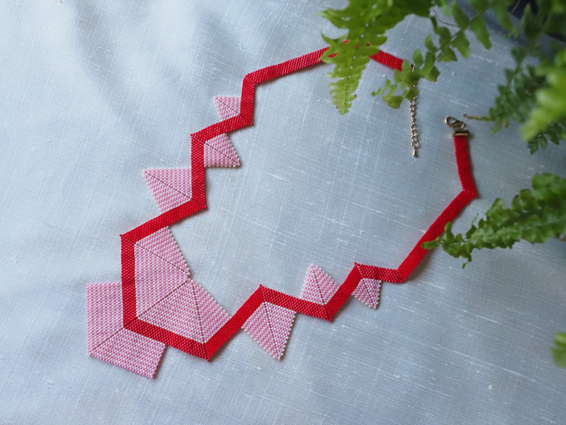 Este collar propone un recorrido minimalista: un zigzag rojo intenso atraviesa superficies triangulares en degradados de rosa y blanco, como si el collar dibujara sobre el cuerpo una de esas líneas tensas y contundentes que Rayo solía trazar para desestabilizar la quietud del plano. Aquí, la geometría se vuelve joya, y la joya se transforma en un lienzo portátil.