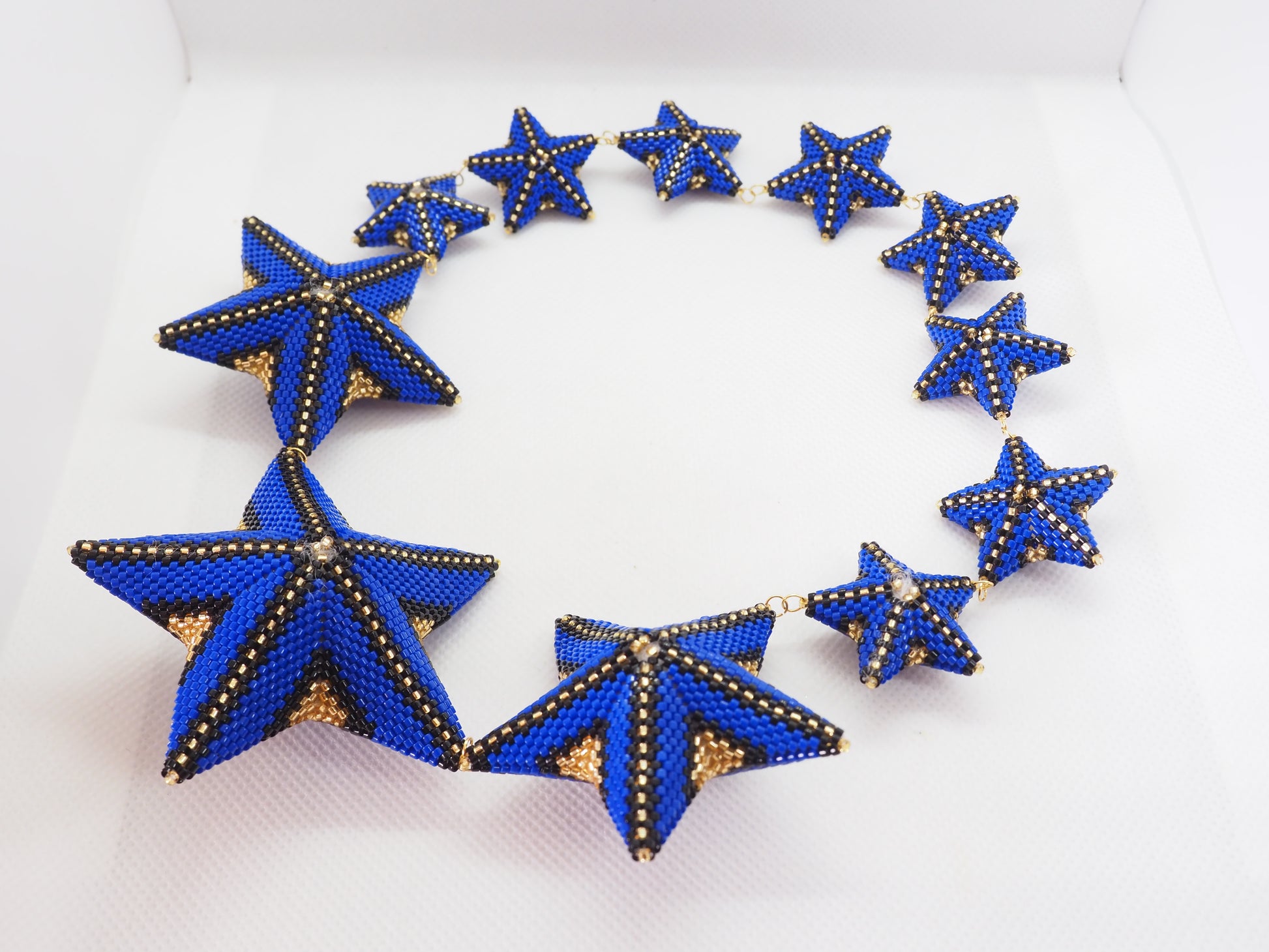 Este impresionante collar está hecho a mano con cuentas japonesas Miyuki Delica y presenta audaces formas geométricas de estrellas en tonos azul profundo y dorado. Cada elemento está tejido meticulosamente, creando un juego dinámico de luz y estructura. El diseño encarna fuerza, movimiento y elegancia: una pieza única que fusiona arte y artesanía.
